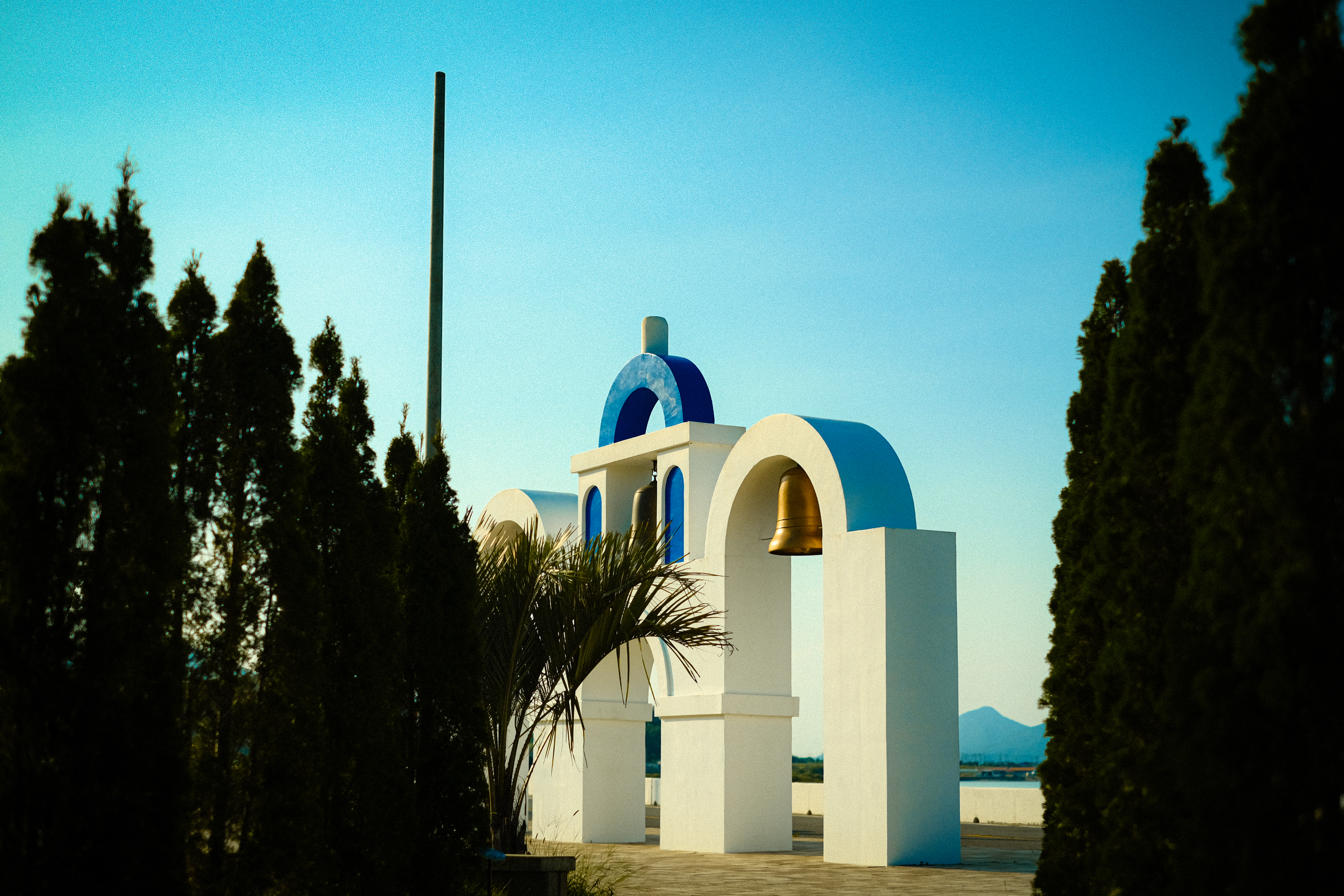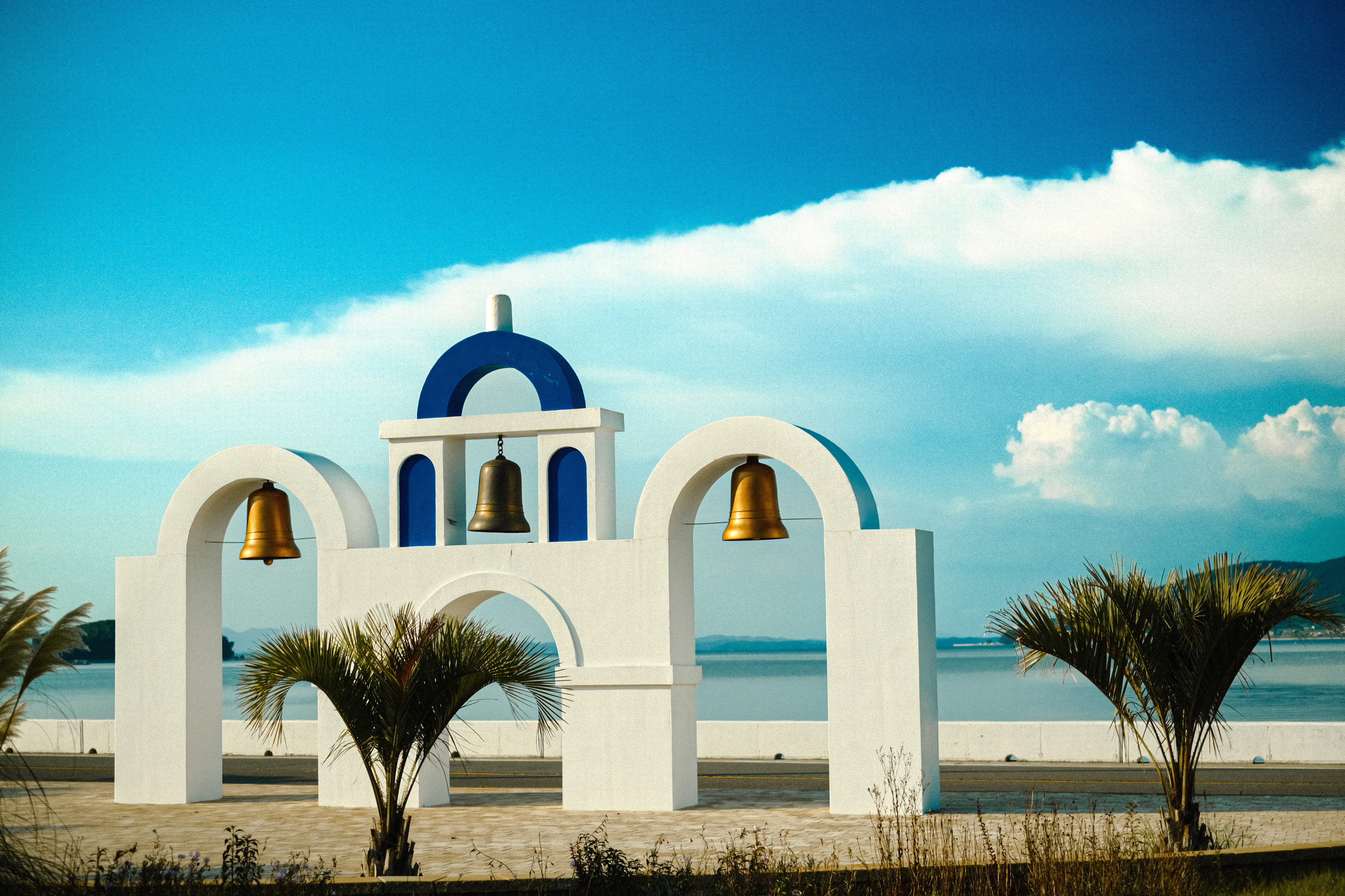 아래 사진 속 조형물은 흰색 기둥과 파란색 반원 지붕, 종탑으로 구성되어 마치 산토리니에 온 듯한 느낌을 주며, 바다가 배경이라 사진이 그림처럼 나옵니다.
